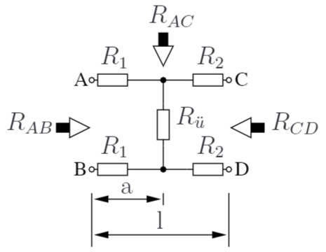 a) Geben Sie für diese Anordnung eine Ersatzschaltung an. b) Berechnen Sie allgemein und zahlenmäßig die Gesamtlänge des Kabels, den Übergangswiderstand und den Abstand a der defekten Stelle von den Enden AB.